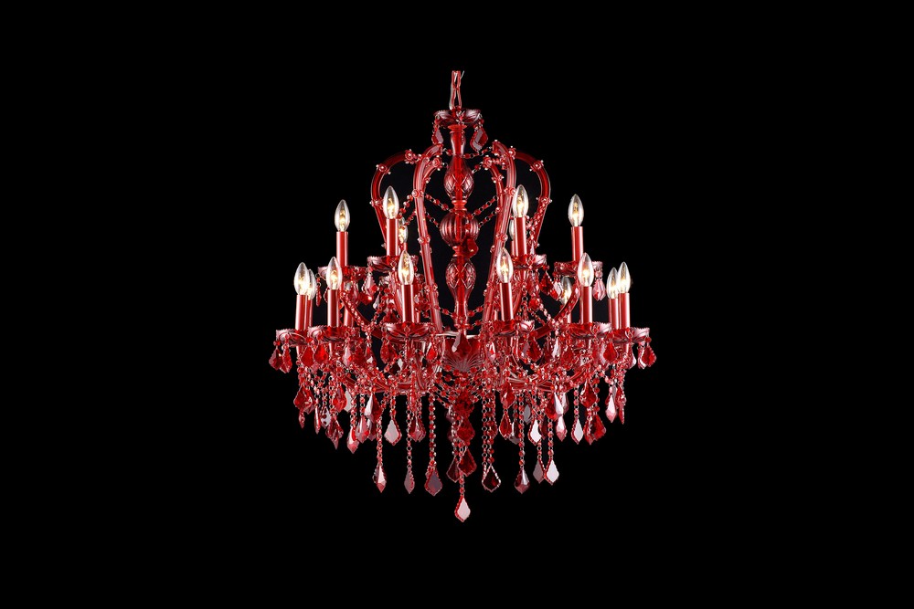 Collection: Crimson Boulevard, Width/Diameter: 34.00", Height: 38.00", Lamp: 18-40w bulb(s), - Desc: the color red varying in hue, The Crimson Blvd. Collection 18 light red crystal chandelier will bring your space a dramatic yet elegant touch of color.