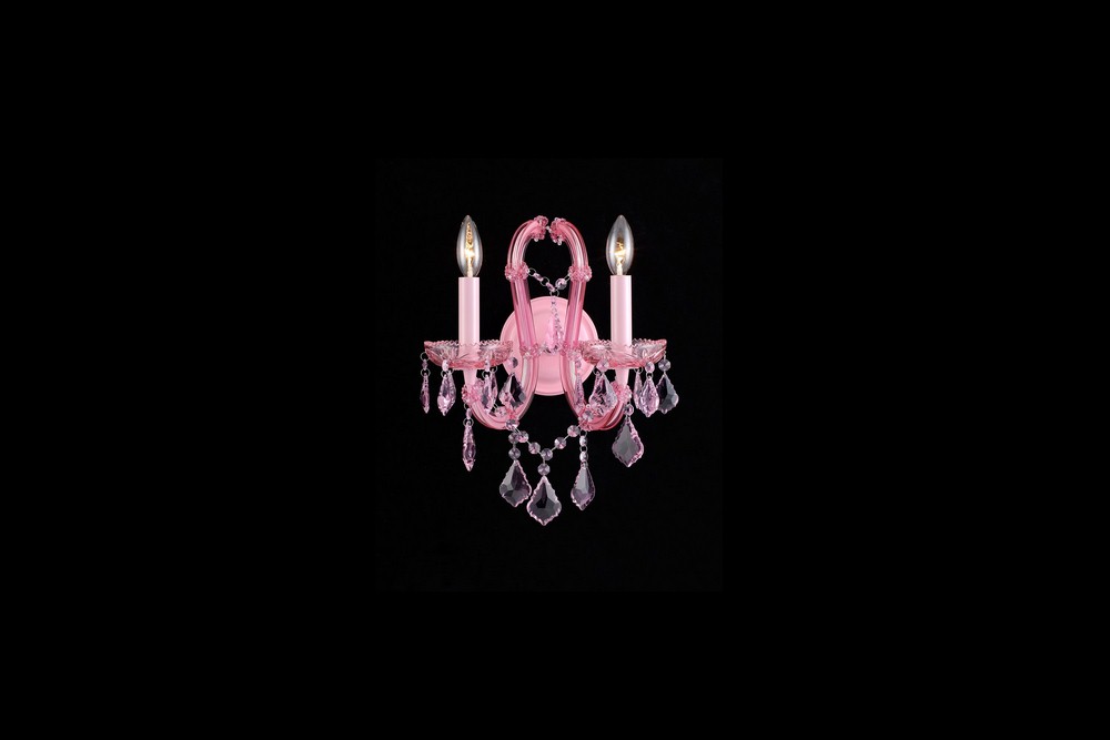 Collection: Sunset, Width/Diameter: 12.00", Height: 15.00", Depth/Extension: 11.00", Lamp: 2-40w bulb(s), - Desc: The Sunset Collection 2 light pink crystal wall sconce provides a beautiful light pink sunset like beauty into your space.