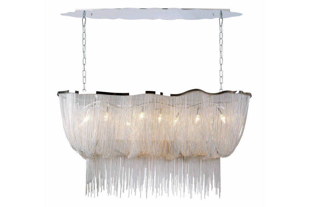Collection: Mulholland Drive, Width/Diameter: 59.00", Height: 32.00", Depth/Extension: 19.00", Lamp: 8-40w bulb(s), - Desc: The Mullholland Dr. Collection linear hanging fixture with its hand crafted black polished nickel frame will completely transform your space to a high end elegant style with its draped and flowing chain.