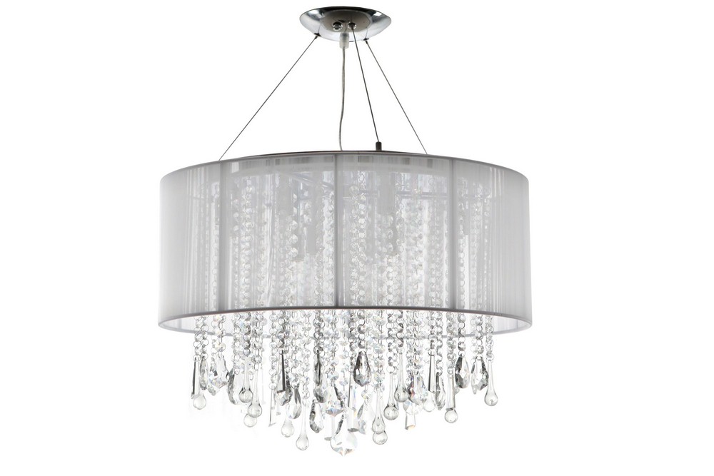 Collection: Beverly Drive, Width/Diameter: 32.00", Height: 24.00", Lamp: 12-40w bulb(s), - Desc: the unique round Beverly Dr. collection convertible ceiling mount's stunning style. Cut and polished crystals are held in place with stainless steel rings and illuminated by brilliant halogen points of light and graced by a beautiful silk string shade. Shade Included: TRUE.