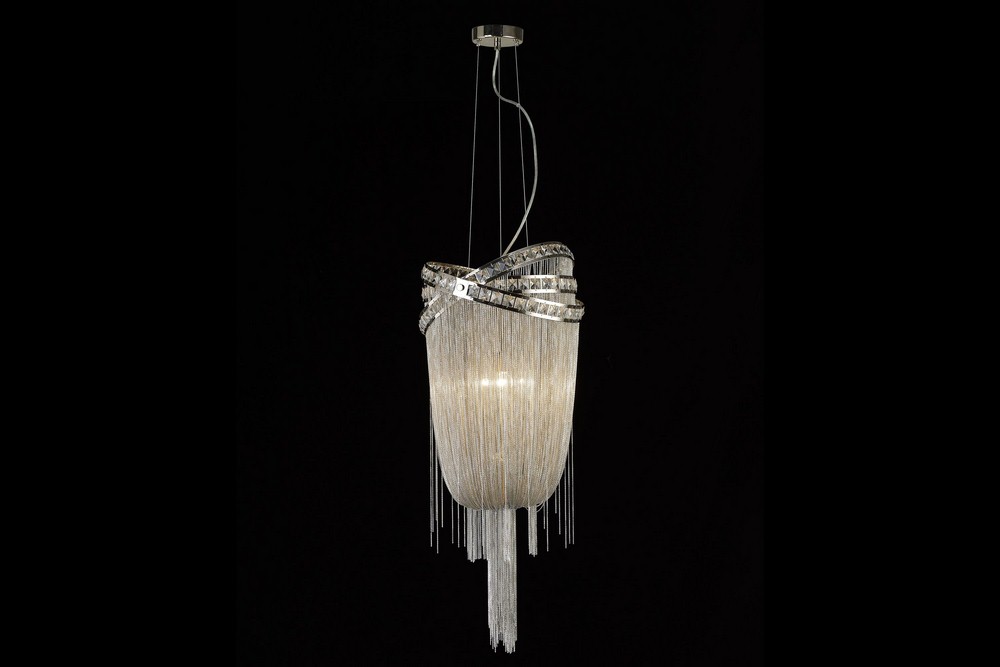 Collection: Wilshire Boulevard, Width/Diameter: 15.00", Height: 36.00", Lamp: 3-100w bulb(s), - Desc: The Wilshire Blvd. collection polished nickel chain foyer hanging fixture will bring any space a unique and romantic feel. Its flowing and draped chain and clear hand cut and polished crystals embedded within a steel frame will illuminate romantic shadows onto your walls. Shade Included: TRUE.