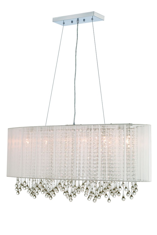 Collection: Beverly Drive, Width/Diameter: 39.50", Height: 17.00", Lamp: 6-40w bulb(s), - Desc: the unique round Beverly Dr. collection convertible ceiling mount's stunning style. Cut and polished crystals are held in place with stainless steel rings and illuminated by brilliant halogen points of light and graced by a beautiful silk string shade. Shade Included: TRUE.